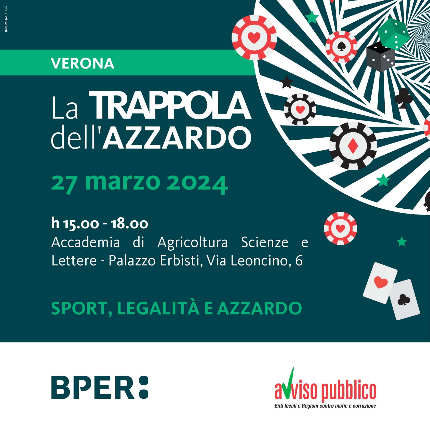 Si svolgerà a Verona mercoledì 27 marzo 2024 la seconda tappa del progetto di Avviso Pubblico e BPER Banca, intitolato “La trappola dell’azzardo”.