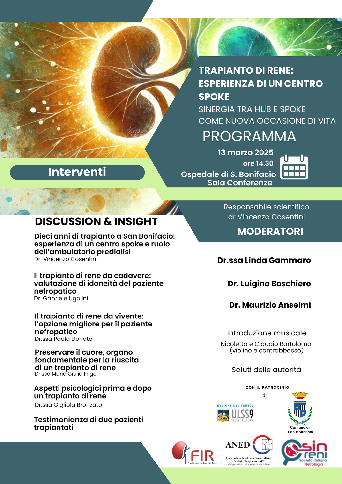 L’evento è organizzato dalla UOC Nefrologia e Dialisi di San Bonifacio, diretta dalla Dott.ssa Linda Gammaro, con il patrocinio dell’Azienda ULSS 9 Scaligera, Comune di San Bonifacio, Società Italiana Nefrologia, ANED - Associazione Nazionale Emodializzati Dialisi e Trapianto, e FIR - Fondazione Italiana del Rene.