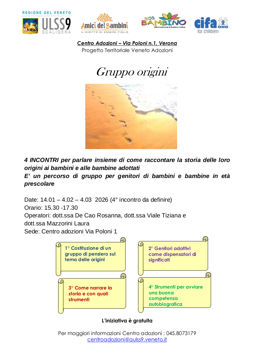 Pubblicato il venerdì 09 Gennaio 2026 Il Centro adozioni di Verona organizza un ciclo di incontri dal titolo "Gruppo origini". L'iniziativa prevede 4 appuntamenti, rivolti ai genitori adottivi di bambini in età prescolare dei Distretti 1 e 2 dell'ULSS 9 Scaligera. Un'occasione per parlare insieme di come raccontare la storia delle loro origini ai bambini adottati. Il percorso rientra nelle iniziative del Progetto territoriale Veneto adozioni .