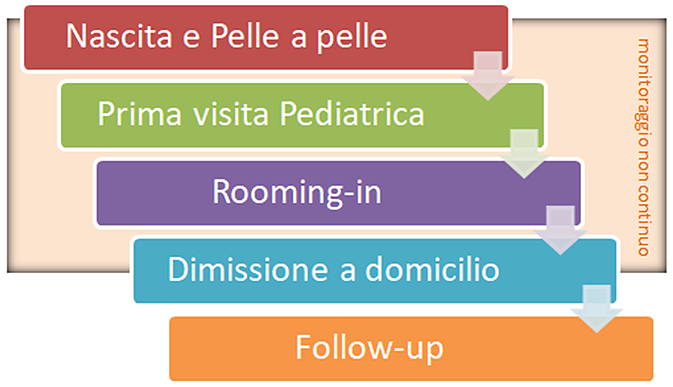 Il neonato rimane in rooming-in con la madre. I controlli vengono effettuati dal personale direttamente in stanza, permettendo di mantenere il contatto pelle a pelle e la continuità dell’allattamento.